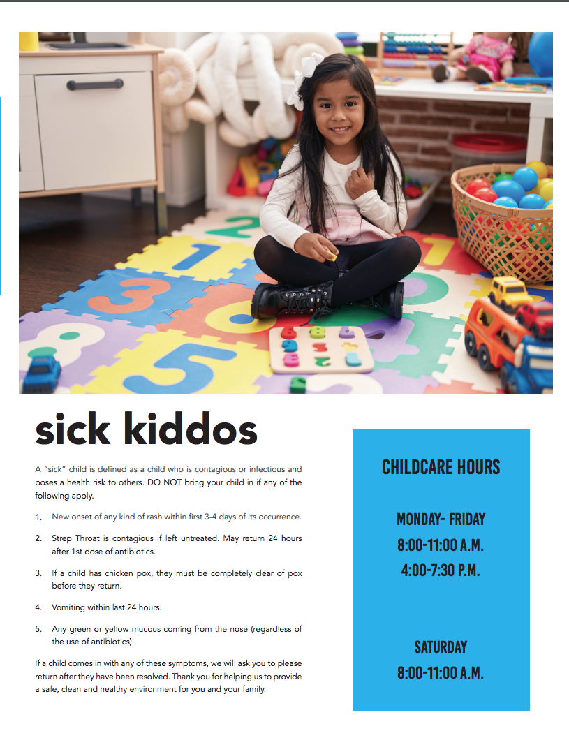 Our childcare room is filled with age-appropriate toys, learning activities, and friendly staff who love working with children. It's the perfect space for your kids to play while you focus on your health and wellness.